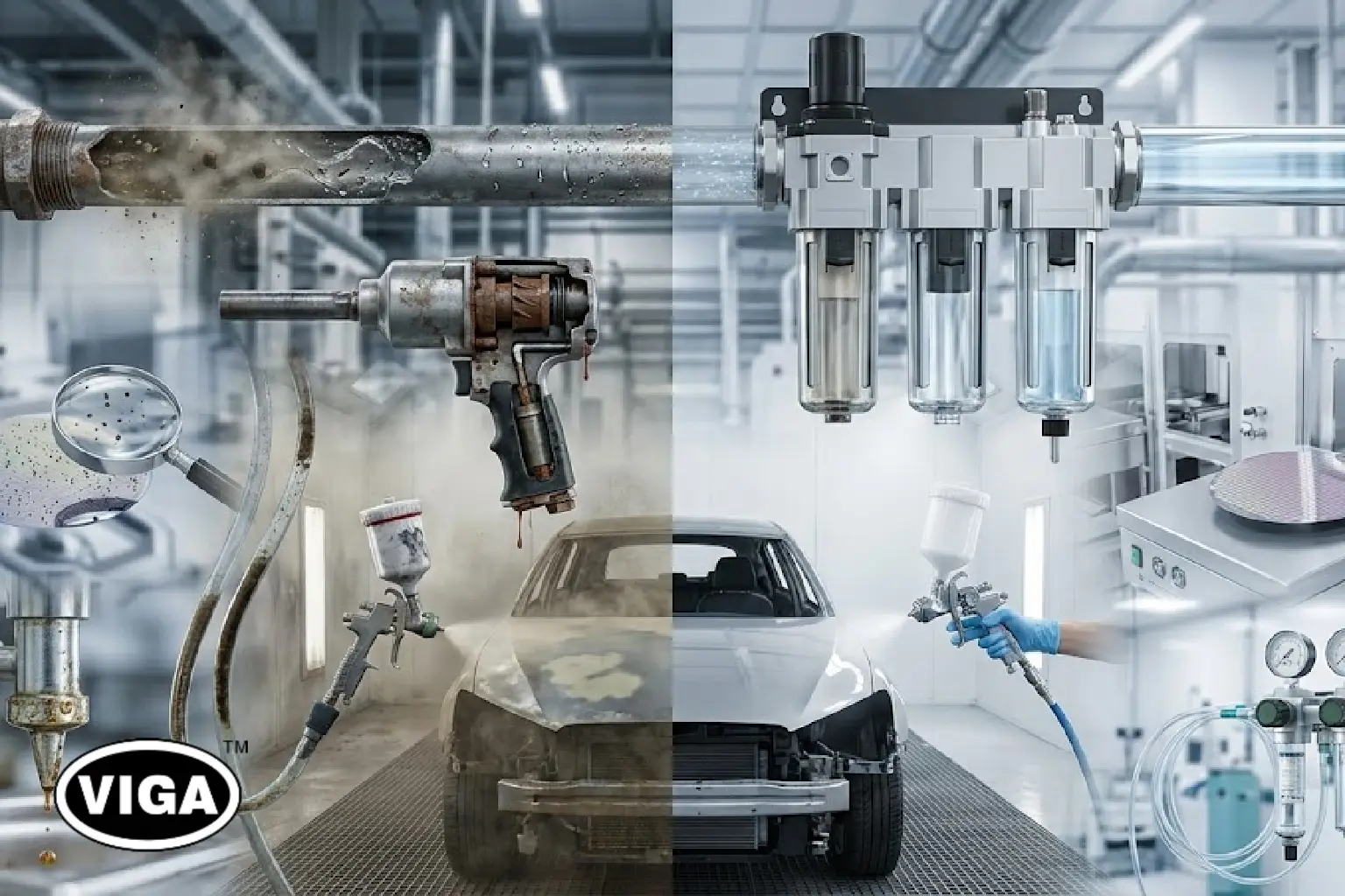 • High-Gloss Automotive Painting: This is an industry where perfection is visible. A single tiny droplet of oil or water mist in the air line leaves an unfixable defect (“fisheye”) in the expensive paint, often resulting in sanding the piece down and starting the entire high-labour process over. Dedicated ultra-high-efficiency filtration systems protect the entire operation from this expensive human error, ensuring only pure, dry air is applied.